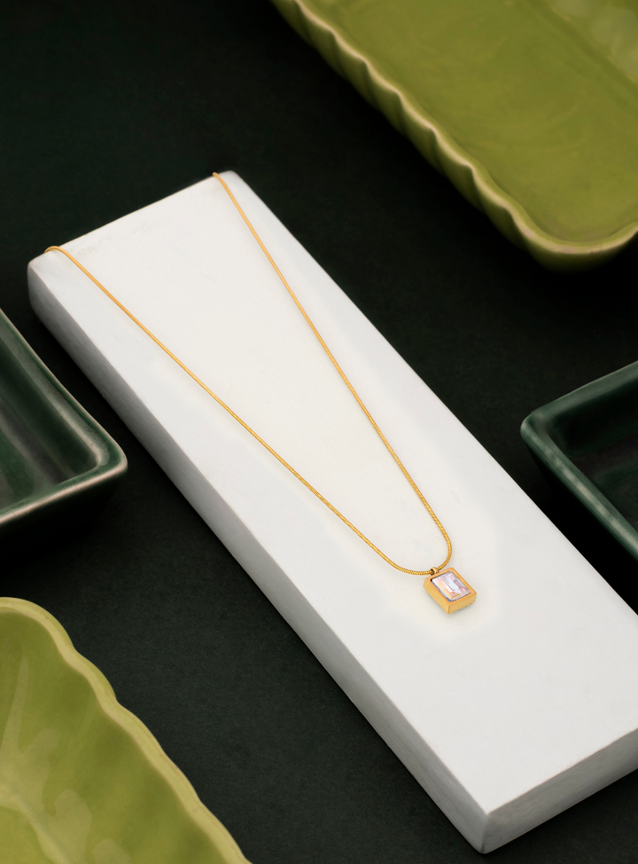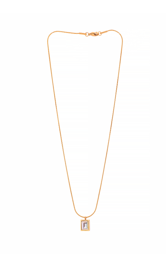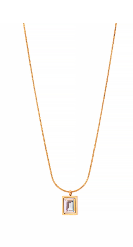 Sleek and elegant gold-toned necklace featuring a rectangular pendant with a faceted, clear crystal centerpiece. The pendant is bordered in a polished gold frame, giving it a minimal yet luxurious appearance. The fine chain complements the modern, geometric design, making it suitable for both everyday wear and special occasions.