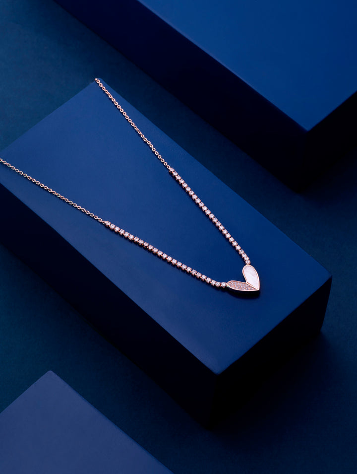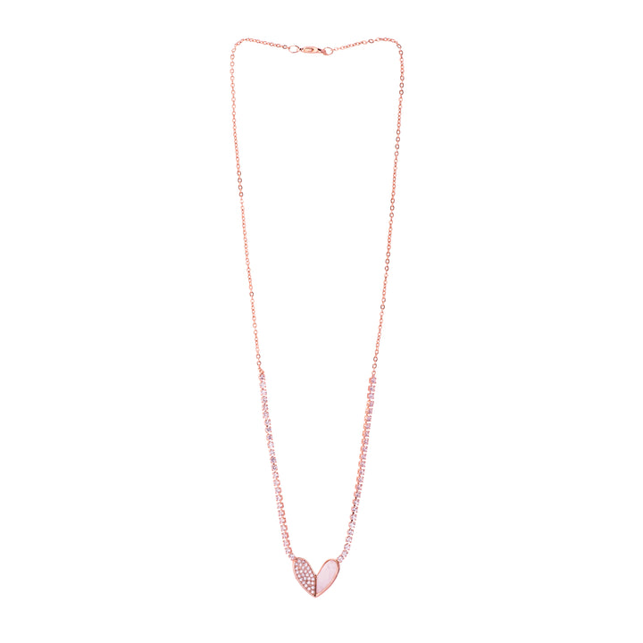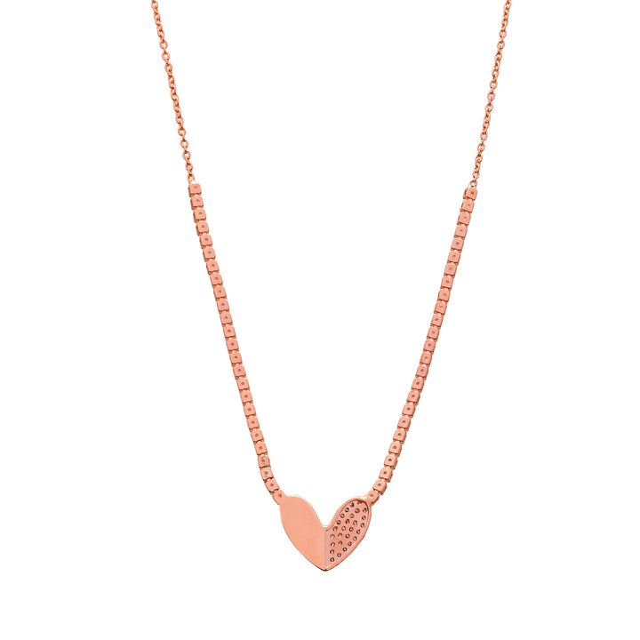 This necklace features a delicate chain with a heart-shaped pendant. One half of the heart is a smooth, polished rose gold-tone surface, while the other half is embellished with small, pavé-set stones, giving it a sparkling appearance.