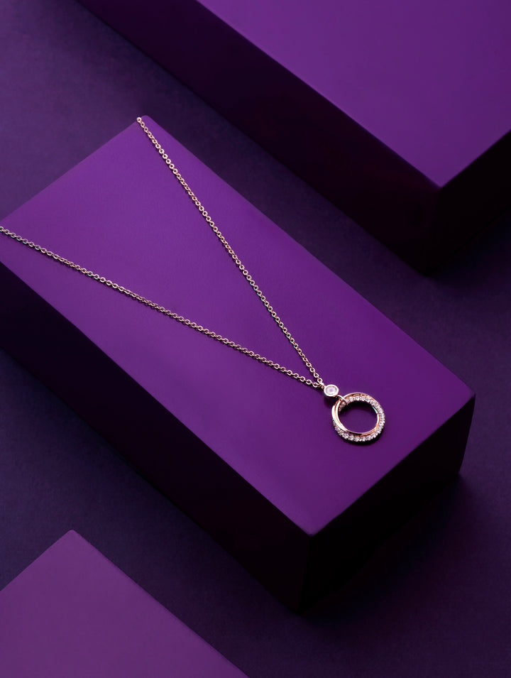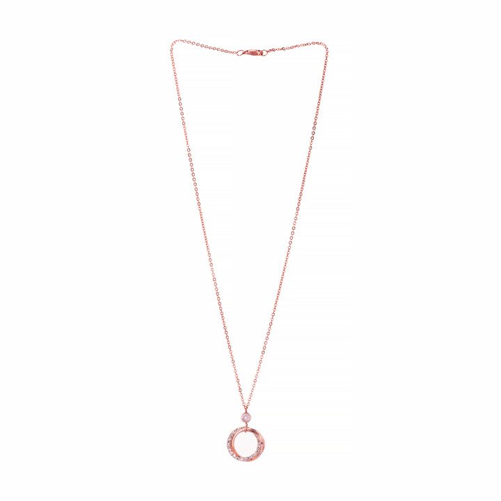 - Pendant Details: One of the circles in the pendant is polished rose gold-tone, offering a smooth and reflective surface. The other circle is beautifully embellished with what appears to be a continuous line of clear, sparkling cubic zirconia stones, adding a brilliant contrast and shimmer to the design.