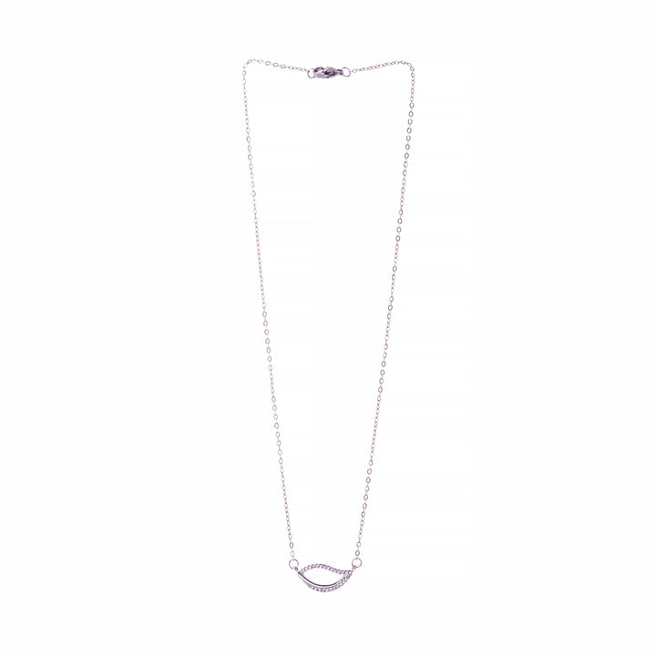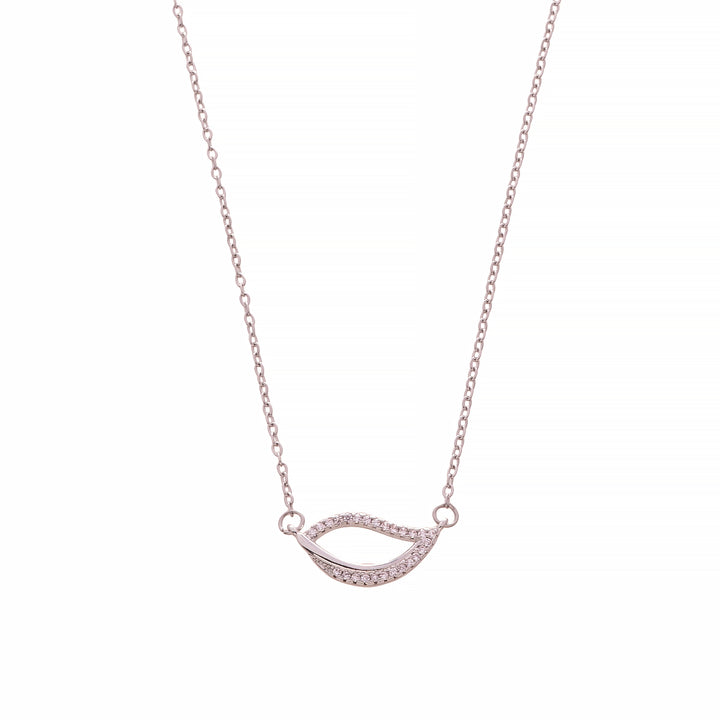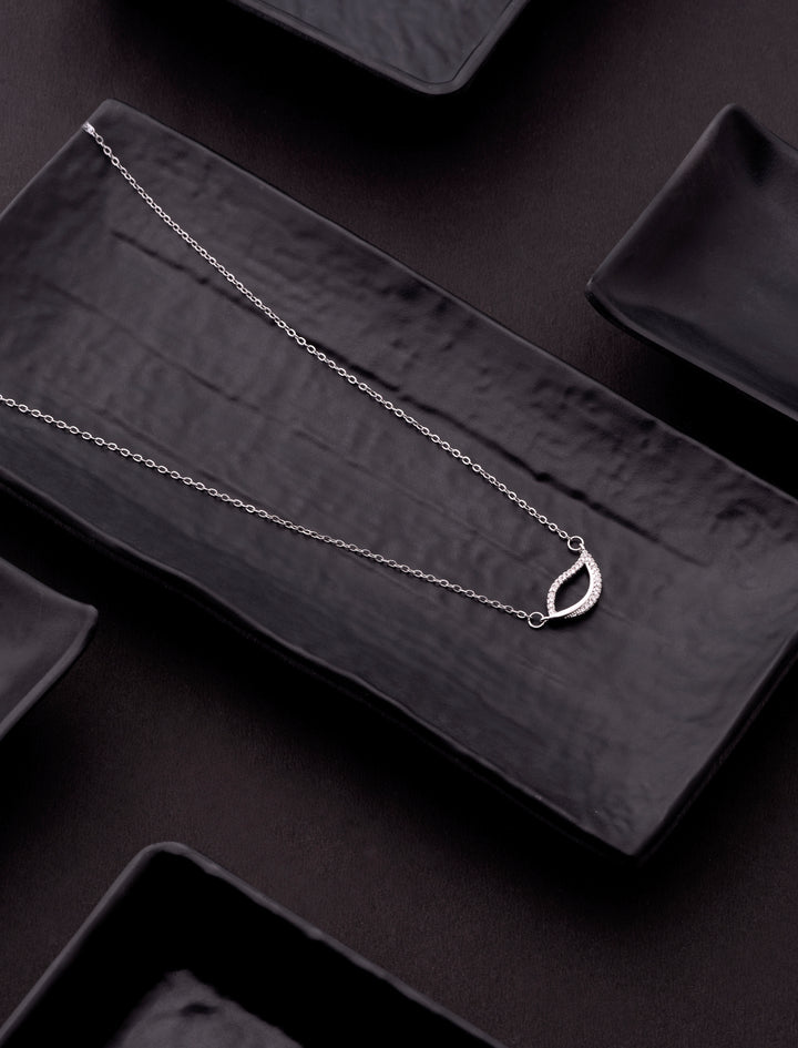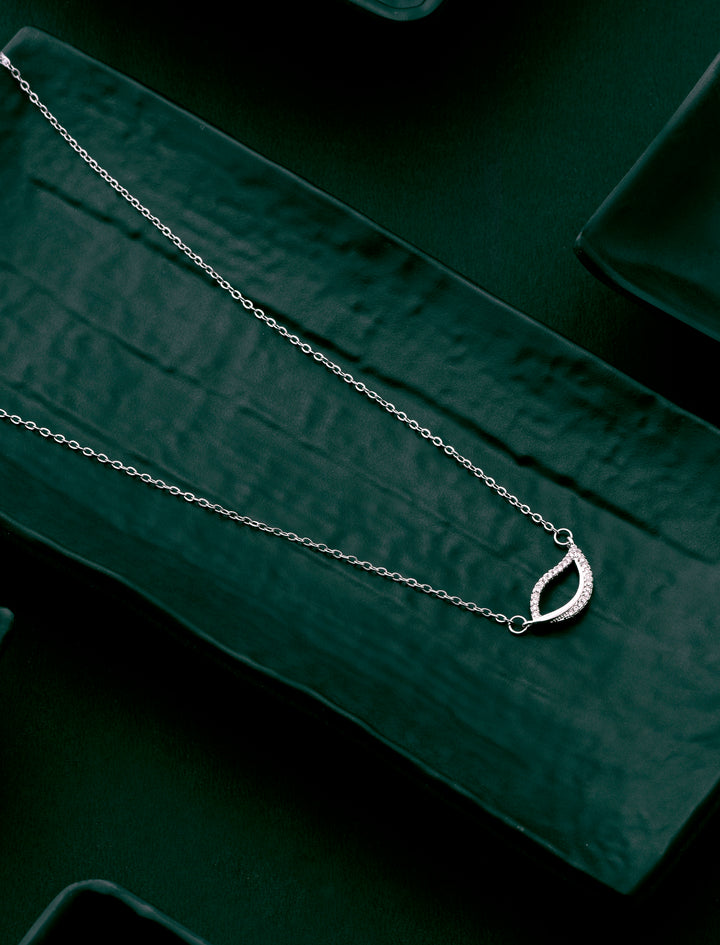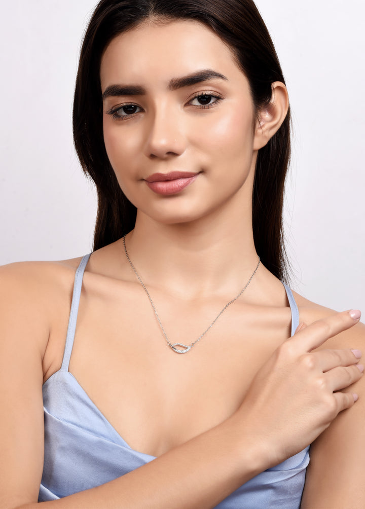 - Pendant Design: The focal point is a horizontally oriented, elegant pendant shaped like a marquise or a stylized leaf/eye. One half of this shape is a smooth, gleaming silver surface, while the other half is intricately embedded with a row of small, round, sparkling stones.