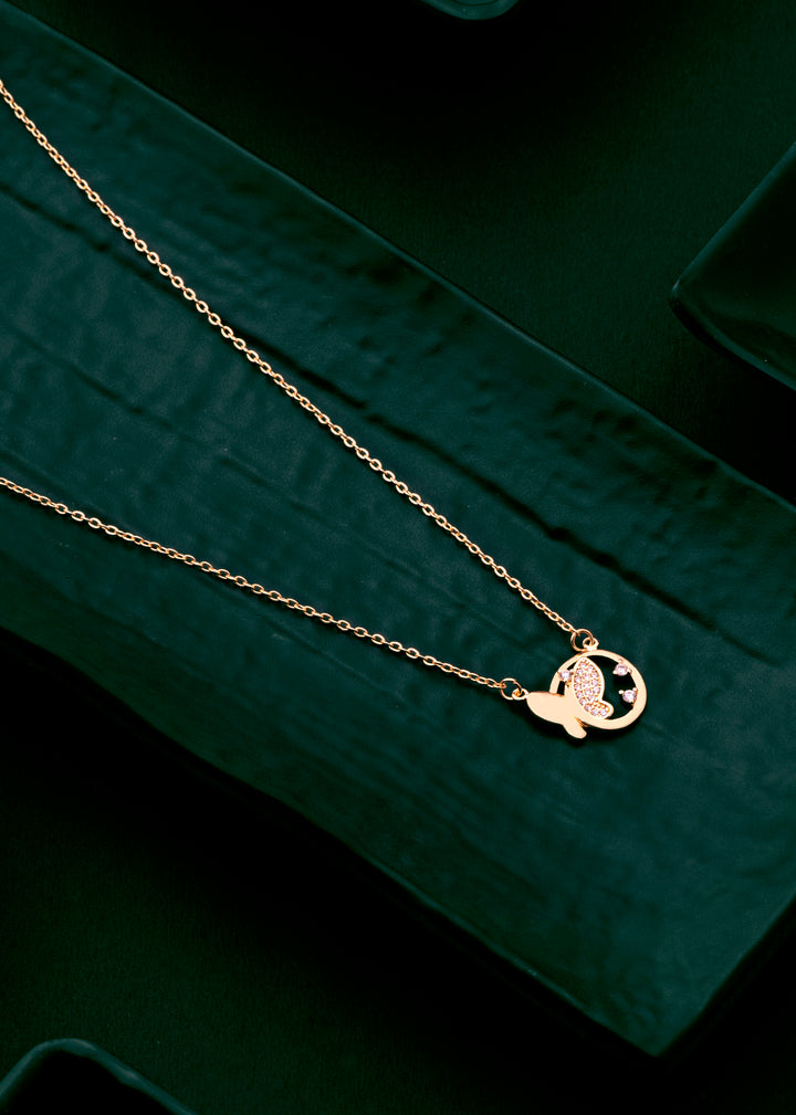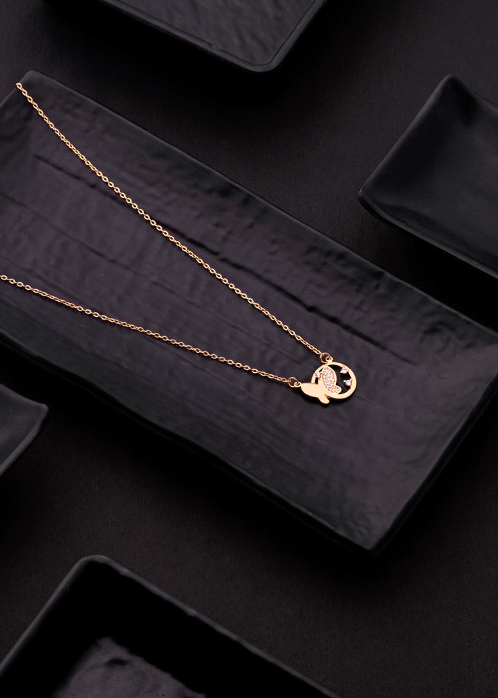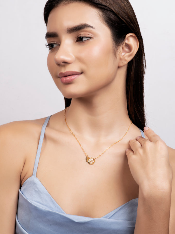 - Metal & Finish: The necklace, including its delicate chain and the central pendant, gleams with a radiant gold finish, a gold-plated.