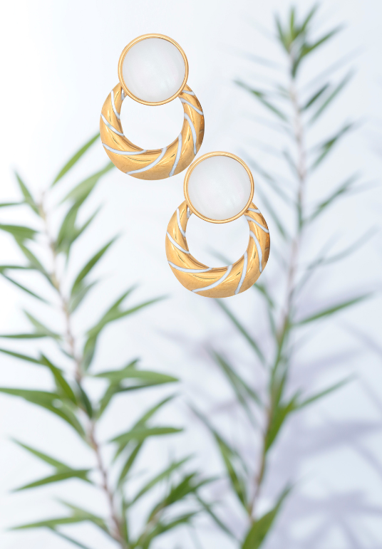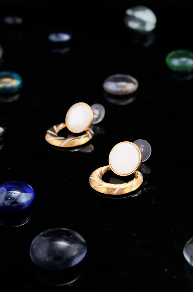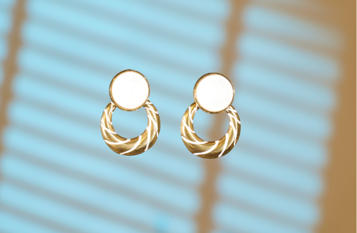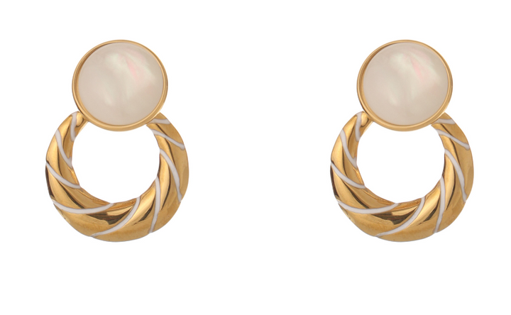 | Chic Statement Stud-Drop Earrings blending modern elegance with timeless charm, round mother-of-pearl stud with gold-plated circular hoop |