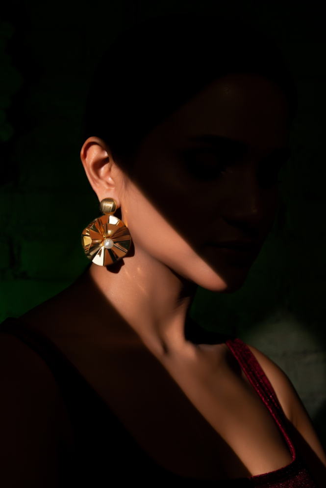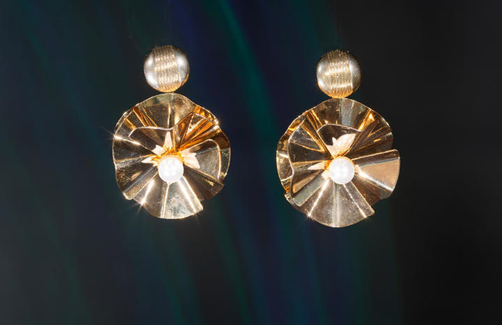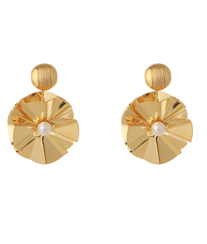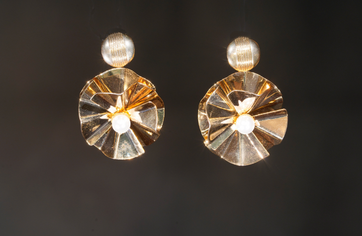 | Gold-Plated contemporary Fancy Floral Pattern Elegant Stud Earrindrop earrings, has pearls Secured with a post and back |